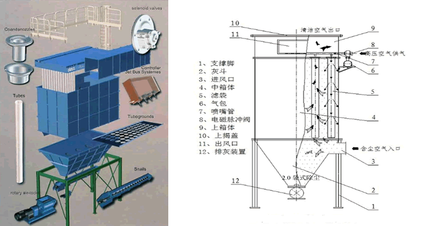 脈沖布袋除塵器由灰斗、上箱體、中箱體、布袋(根據(jù)煙氣溫度不同,可采用PTFE、P84等高性能復(fù)合布袋)、清灰噴吹裝置等部分組成。工作時(shí),高溫?zé)煔庥苫叶飞系倪M(jìn)風(fēng)口流入灰斗,由于重力沉降作用,粗塵粒直接落入灰斗底部,起到預(yù)收塵的作用,同時(shí)氣流速度變慢,輕微粉塵隨氣流轉(zhuǎn)折向上進(jìn)入中箱體,粉塵被高溫濾袋過(guò)濾阻留,積附在濾袋外表面,過(guò)濾后的氣體透過(guò)濾袋進(jìn)入上箱體至出風(fēng)口,經(jīng)引風(fēng)機(jī)排至大氣。積附在濾袋外壁的粉塵不斷增加,當(dāng)達(dá)到設(shè)定時(shí)間,脈沖控制儀順序間隔觸發(fā)開(kāi)啟脈沖電磁閥,使壓縮空氣包內(nèi)的壓縮空氣經(jīng)噴吹管對(duì)各排濾袋進(jìn)行脈沖噴吹清灰,使濾袋在瞬間急劇膨脹抖落積附在濾袋外壁的粉塵,從濾袋上剝離的粉塵沉降至灰斗,經(jīng)過(guò)卸灰閘閥排出,除塵效率≥99%,適應(yīng)于各種除塵行業(yè)。