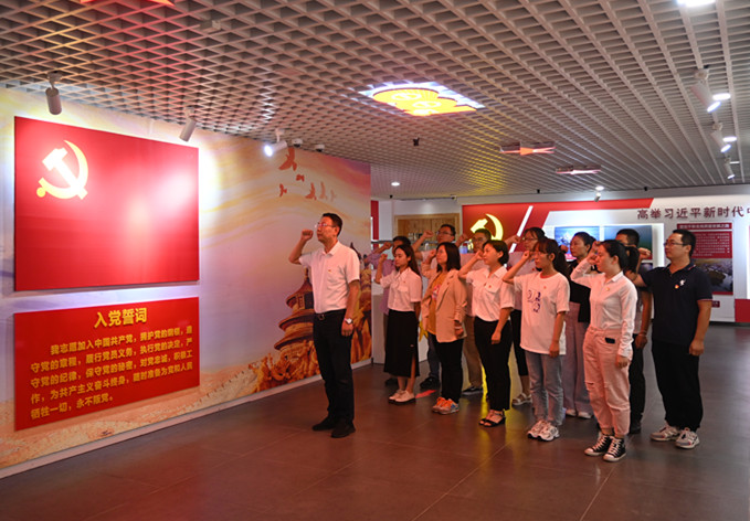 在黨性體檢中心,全體黨員重溫入黨誓詞,大家面對鮮紅黨旗,用擲地有聲的錚錚誓言表達對黨始終如一的忠誠。
